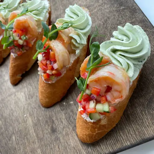 На выбор — Брускетта с креветкой, муссом из базилика и овощной сальсой, 5 шт. — Брускетта с чесночными креветками на тыквенной подушке, 6 шт.