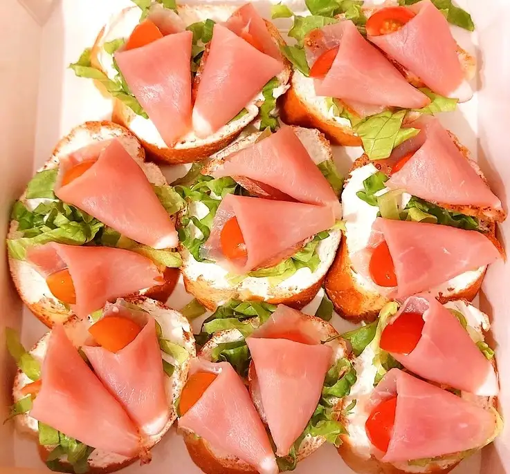 Брускетта с полендвицей, свежей зеленью, черри и сливочным сыром.