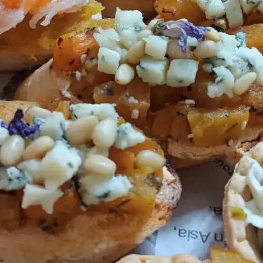 Брускетта с пряной тыквой и сыром дорблю — яркое и насыщенное блюдо, в котором гармонично переплетаются осенние вкусы, создавая уютную атмосферу.
