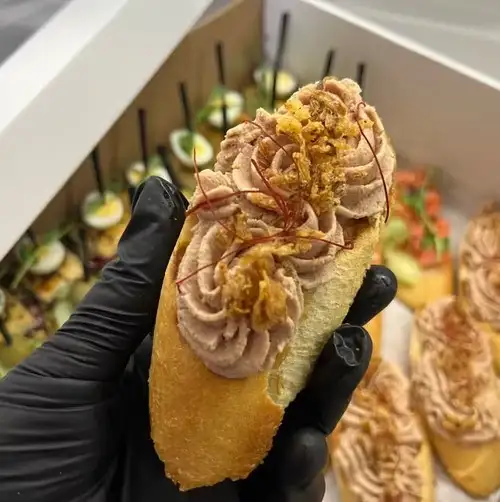 Свежий поджаренный на гриле багет , утиный паштет и хрустящий лучок