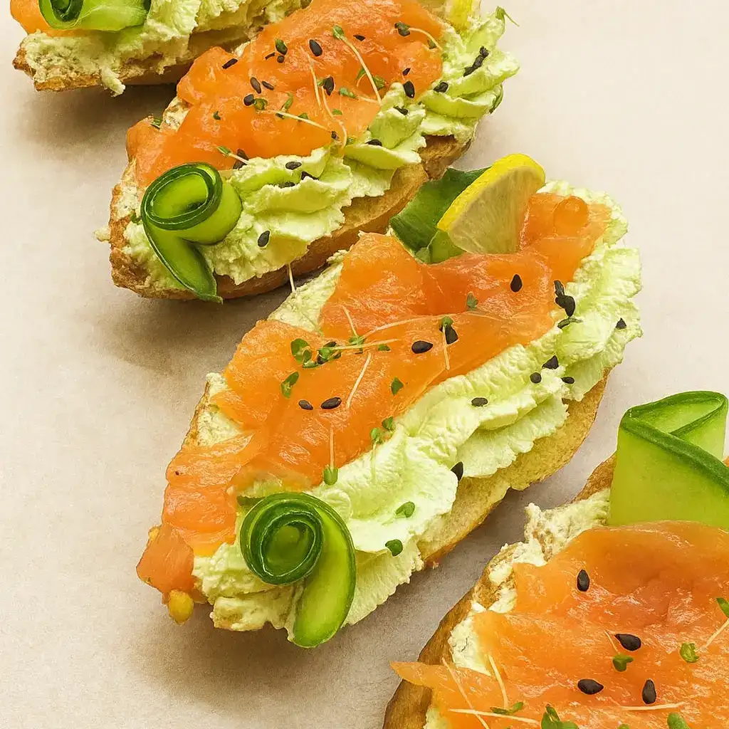 В ассортименте: — Брускетта с форелью и муссом из авокадо — Брускетта с мидиями на особой подушке — Брускетты с креветками и ананасом — Брускетты с томлёный грушей и сыром Бри