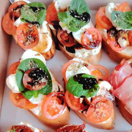 Багетт, слив.сыр, помидоры черри, сыр Мацарела, Шпинат. Соус.