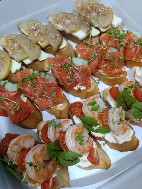 Ароматная закуска с тонкими ломтиками слабосолёной форели и творожным сыром. Обладает нежным, слегка солоноватым вкусом, прекрасно дополняет фуршетный стол. Гармоничное сочетание копчёных нот и свежей зелени.