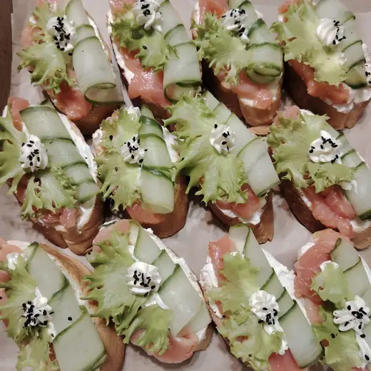 Багетт, форель, огурец, слив.сыр. Зелень.