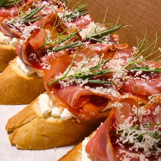 Брускетты с прошутто, клюквенным соусом и сыром Пармезан.
