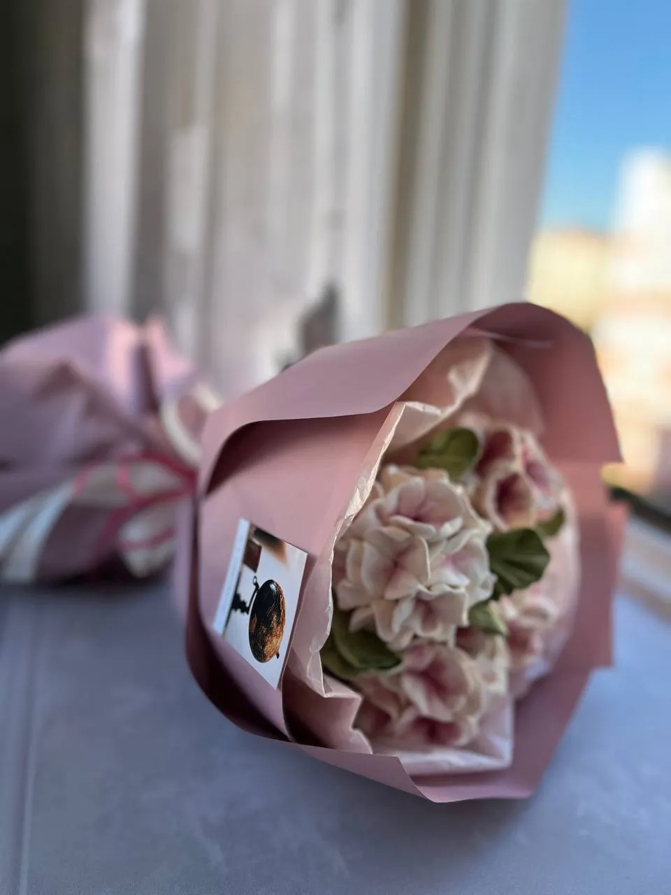Компактный, вкусный букет из гортензий, которые изготовлены из натурального зефира. Размер букета даёт возможность удобно и легко держать в руке детям. Идеальный вариант букета для школьников к началу учебного года.