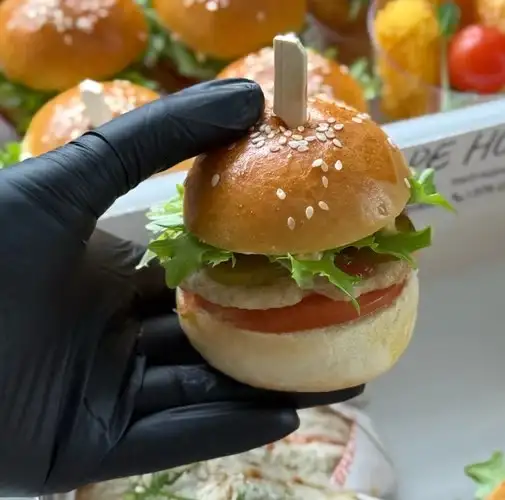 Бургер с куриной котлетой, сыром, помидором, сол.огурчиком, салатом, соусом/ кетчупом