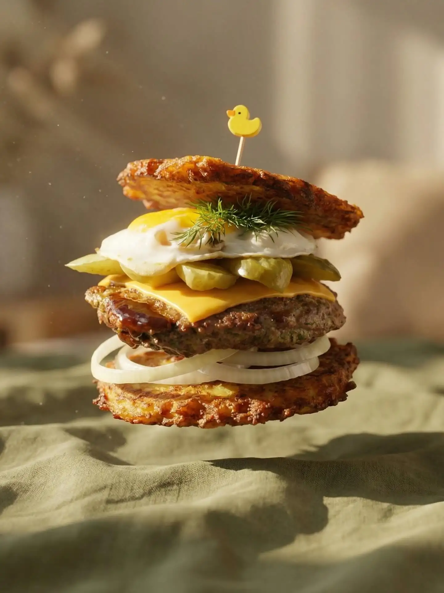 Драники, котлета, соус, лук, сыр, соленый огурец, яйцо.