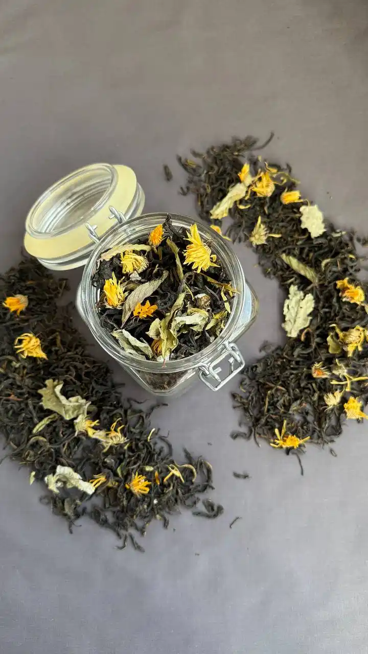 Чайный сбор с иван-чаем, мятой и календулой — это не только вкусный, но и полезный напиток, обладающий множеством уникальных свойств и качеств. Иван-чай содержит множество витаминов (С, В1, В2, В5), минералов и антиоксидантов. Обладает успокаивающим действием, помогает снять стресс и напряжение, способствует улучшению сна, помогает в борьбе с воспалительными процессами в организме. Регулярное употребление Иван-чая способствует повышению иммунитета. Поддерживает пищеварение. Мята известна своим освежающим ароматом и приятным вкусом. Она обладает успокаивающим действием, помогает расслабиться, уменьшает тревожность и стресс. Обладает антимикробным действием, что способствует поддержанию здоровья полости рта. Мята помогает при расстройствах пищеварения и вздутии живота. Календула — это яркое и красивое растение, известное своими лечебными свойствами. Календула помогает при воспалительных процессах, как внутреннего, так и наружного характера. Она защищает клетки от повреждений, вызванных свободными радикалами. Календула также обладает легким успокаивающим эффектом, что делает ее отличным дополнением к расслабляющим чаям. Когда вы пьете этот чай, вы ощущаете баланс между травяной сладостью Иван-чая, освежающей ноткой мяты и мягким цветочным акцентом календулы. Напиток может быть как теплым, так и охлажденным, что делает его универсальным для любого времени года. В целом, это сочетание создает гармоничное и успокаивающее вкусовое впечатление, которое приятно расслабляет и поднимает настроение.