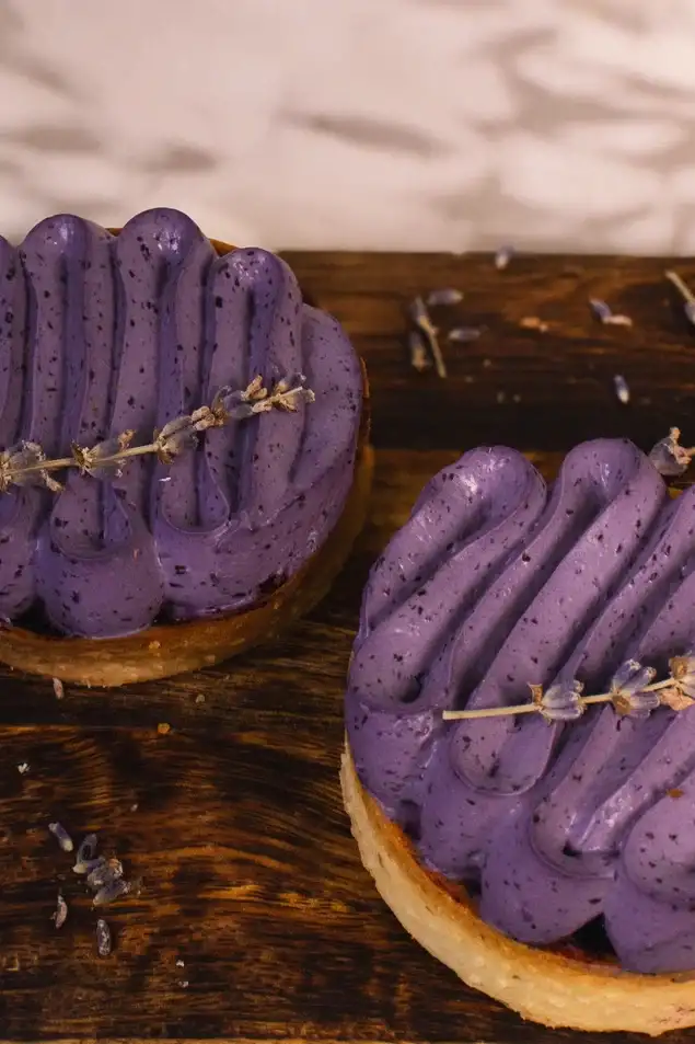 Тарталетка миндальной муки, внутри черничный гель, на основе натуральной черники, сверху украшена ганашом на основе белого шоколада, натуральной черники и сливок.