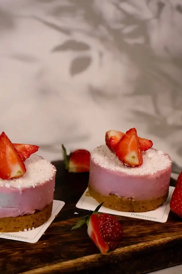 Чизкейк на основе кокосовых сливок, орехов кешью и свежей клубники, на основе бисквита из безглютеновой муки и кокосовой стружки, внутри находится свежая клубника.