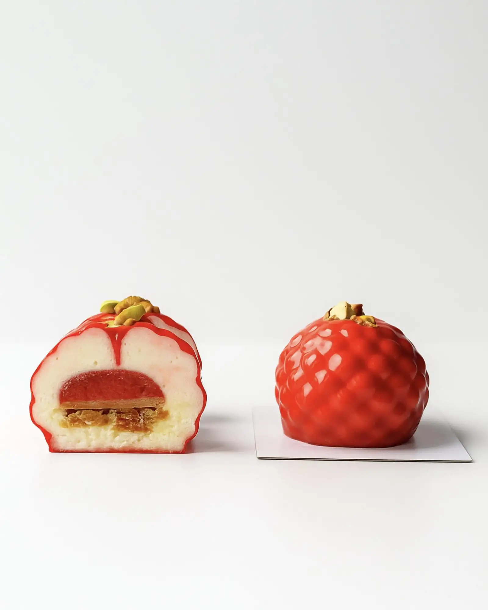 1 шт. — 110 г Серединка (Фисташка-Клубника: Клубника замороженная Сахар-песок Пектин NH Хрустящий слой (Фисташка-Клубника) Белый шоколад Крошка вафельная Масло сливочное 82,5% Пудра сахарная Мука пшеничная Яйцо куриной Мусс (Фисташка-клубника) Желатин пищевой Сливки 33% Сахар-песок Сыр мягкий «Кремчиз» 70% Глюкозный сироп 43% Бисквит Фисташковый: Пудра сахарная Мука миндальная Фисташковая Белок: Сахар-песок Фисташка Глазурь (Фисташка-Клубника): Желатин пищевой Молоко 3,2% Глюкозный сироп 43% Вода Сахар-песок Шоколад Белый Фисташка Сабле миндальное: Масло сливочное 82,5% Пудра сахарная Мука миндальная Мука пшеничная Соль Яйцо куриное Крахмал картофельный
