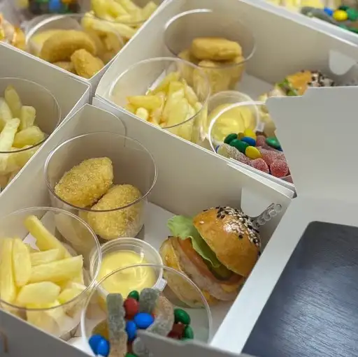 Заказ от 10 шт. Состав: — Мини-Бургер — Картофель фри — соус — овощной/фруктовый стаканчик