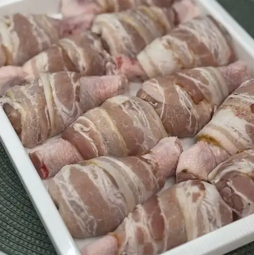 Голень куриная, фаршированная сыром и зеленью, завернутая в бекон, обладает насыщенным и сочным вкусом. Сочетание нежного куриного мяса с расплавленным сыром и ароматной зеленью создает гармоничное сочетание. Бекон добавляет пикантности и хрустящей текстуры, а также усиливает общий вкус блюда. При запекании бекон становится золотистым и хрустящим, придавая блюду аппетитный вид. Это идеальный вариант для праздничного стола или семейного ужина.