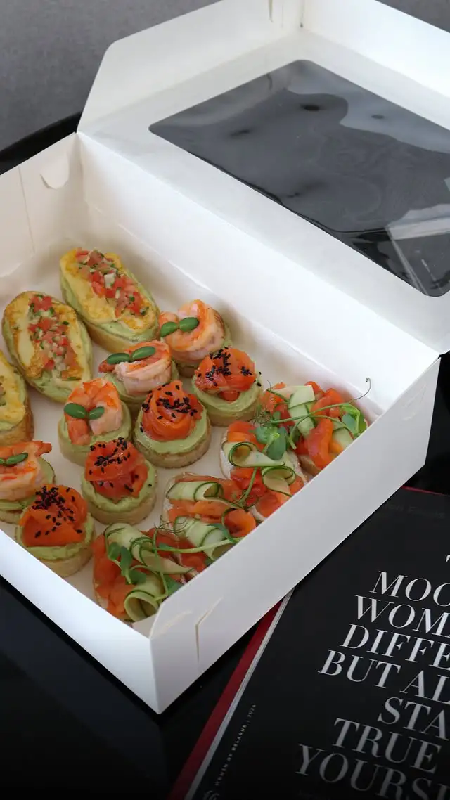 Состав: — тапас с семгой — тапас с креветкой — брускетта с лососем и огурцом — брускетта с сыром халуми и сальсой из томатов