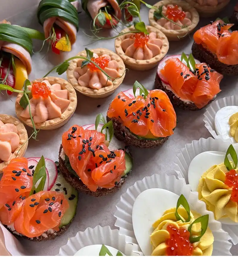 Состав Рулетики из ветчины с болгарским перцем 6 шт Тарталетки с риетом из красной рыбы и творожного сыра 6 шт Мини-бутерброды из ржаного хлеба с творожным сыром, овощами и красной рыбой 6 шт Яйца, фаршированные пастой из желтков и творожного сыра 6 шт