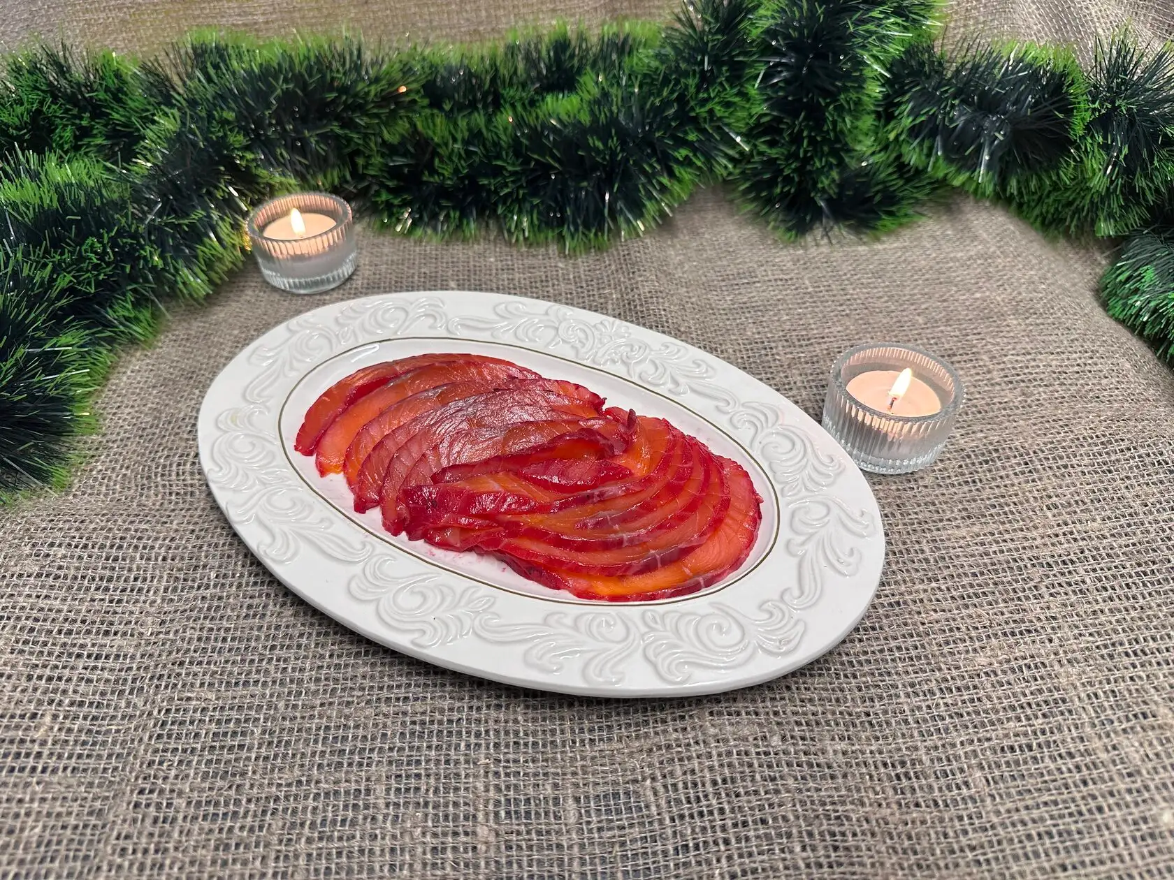 Описание: сбалансированное по соли и специям блюдо. Свекла придает цвет и дополнительную сочность, а хрен и лемонграсс — остроту и пикантность. Состав: форель, соль, сахар, перец чёрный, свекла, хрен, лемонграсс. Вес: 1/120г.