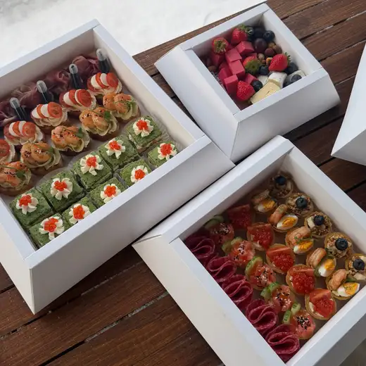 1 коробочка (сыры, мед, орехи, виноград) 2 коробочка (5 видов мини тарталеток по 5 шт) 3 коробочка (шпинатное пирожное, кростини с креветкой, кростини капрезе, кростини с утиным паштетом)