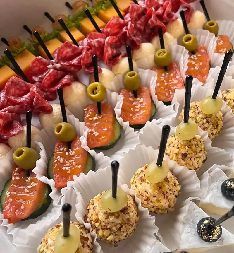 Состав Ветчина-салат-сыр-черри 10 шт Салями-сырные шарики 10 шт Огурец-форель-кисло-сладкий соус-кунжут 7-8 шт Сырные шарики 8 шт Сыр Бри Ягоды, орехи