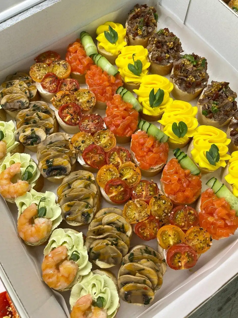 Кростини с говядиной — 6 шт Кростини с красной рыбой — 6 шт Кростини с сырно-яичным паштетом — 6 шт Кростини с запеченными томатами — 6 шт Кростини с шампиньонами — 6 шт Кростини с креветкой — 6 шт