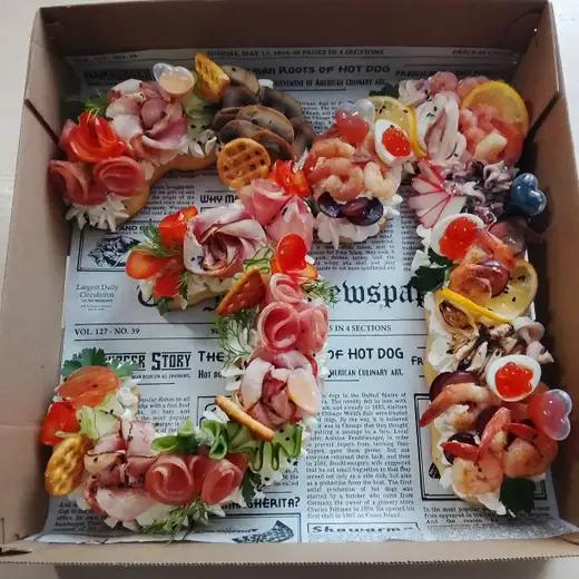 Цифры из заварного теста, внутри творожный мусс с зеленью. Оформление может быть в морской тематике, может быть в мясном исполнении с добавлением декора из овощей