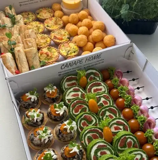 1. Трубочки из лаваша с ветчиной 18 штук 2. Киш тарталетки с брокколи и форелью 10 штук 3. Сырные шарики 28 штук + соус 4. Тарталетки с курицей и грибами 12 штук 5. Шпинат N-ый рулет с форелью 18 штук 6. Канапе cherry колбаска моцарелла 10 штук