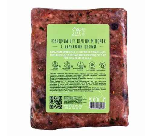 Состав: говядина: мышечная ткань, сердце; куриные шеи, морковь, черника, шпинат, клюква, шиповник, яблоко зеленое, оболочка ржаного и пшеничного зерна, яйцо куриное. Как размораживать/разогревать корм: размораживать корм нужно перед самым кормлением. Положите пакетики с кормом в холодную воду на 15 минут. После этого положите пакетики в тёплую воду на 5–7 минут. Корм должен нагреться до 20—30°С. После того, как корм нагрелся до нужной температуры, можно кормить питомца. Хранить при температуре не выше −8 °C. Срок годности 6 месяцев.
