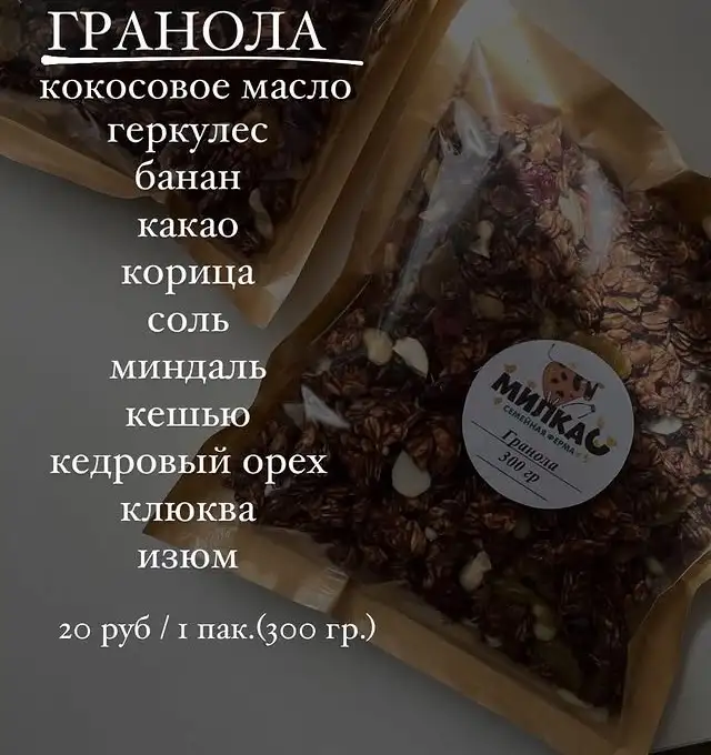 Гранола: кокосовое масло, геркулес, банан, какао, корица, соль, миндаль, кешью, кедровый оре, клюква, изюм