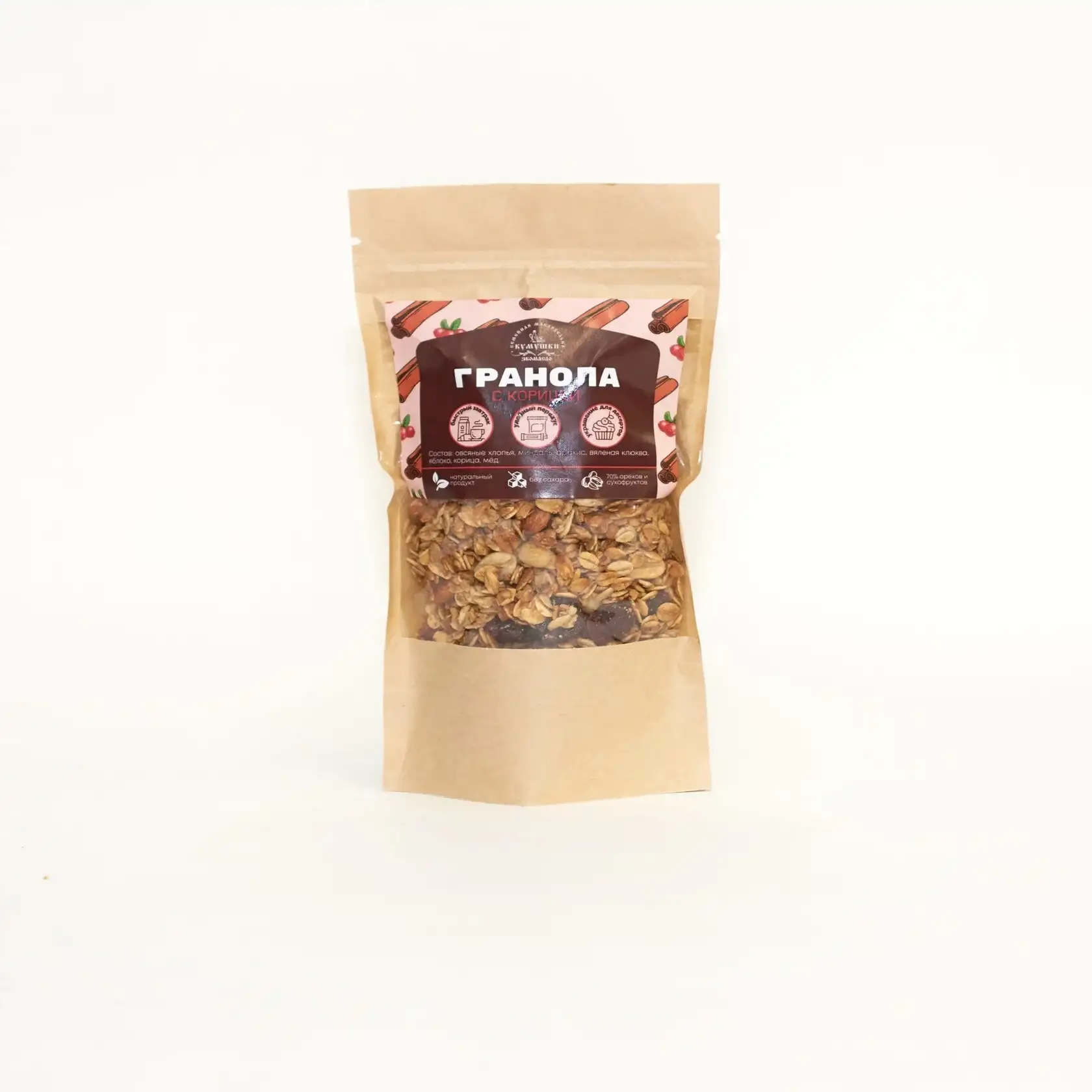 200 г — 8 BYN 300 г — 12 BYN Гранола — это запечённая смесь из овсянки грубого помола, сухофруктов и орехов. Она не содержит сахара, всю сладость ей придаёт мёд или банановое пюре. Как кушать гранолу? залить молоком, кефиром или йогуртом; просто так под любимый фильм; использовать в десертах и выпечке; добавить к творогу или посыпать мороженое.