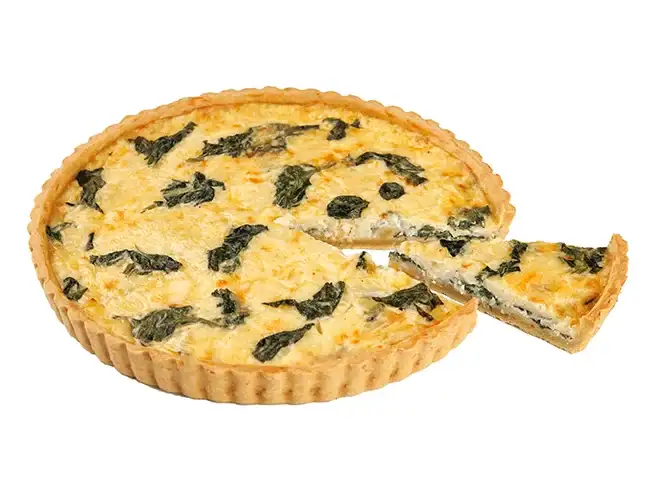 С творожным сыром и шпинатом Нежный сыр и сочные листья шпината — гурманы оценят этот пирог по достоинству! Состав: начинка (брынза, шпинат, лук красный), тесто (масло сливочное, мука пшеничная, яйцо куриное, сахар белый, соль, уксус, гидрокарбонад натрия Е500ii (сода пищевая)), соус (сливки животные, яйцо куриное, сыр). Срок годности: 48 ч. при температуре 4±2°C. Пищевая ценность продукта на 100 г: Калорийность — 210 ккал Белки — 9,5 г Жиры — 12,0 г Углеводы — 16,0 г Рекомендуем резать на кусочки: по весу 500 г на 4 кусочка по весу 850 г на 8 кусочка Уточнения: Вес 500 г — Ø пирога ≈ 18 сантиметров Вес 850 г — Ø пирога ≈ 24 сантиметров Внешний вид изделий может отличаться от фотографий, так как каждый пирог — это ручная работа