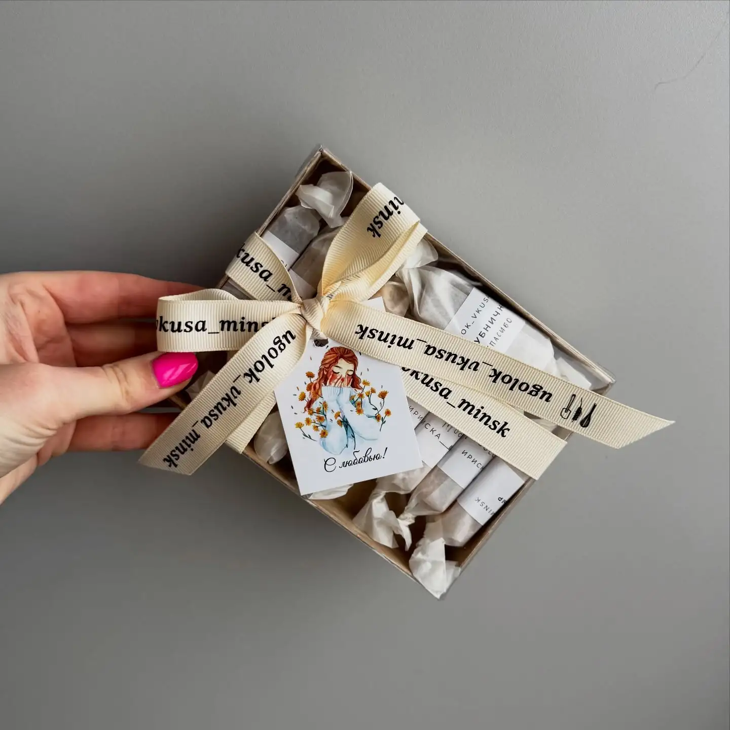 Коробочка 6 шт. — 12 BYN Коробочка 16 шт. — 32 BYN Любое кол-во ирисок, за 1 шт. — 2 BYN Можно добавить соленую карамель, печенье и т.д.