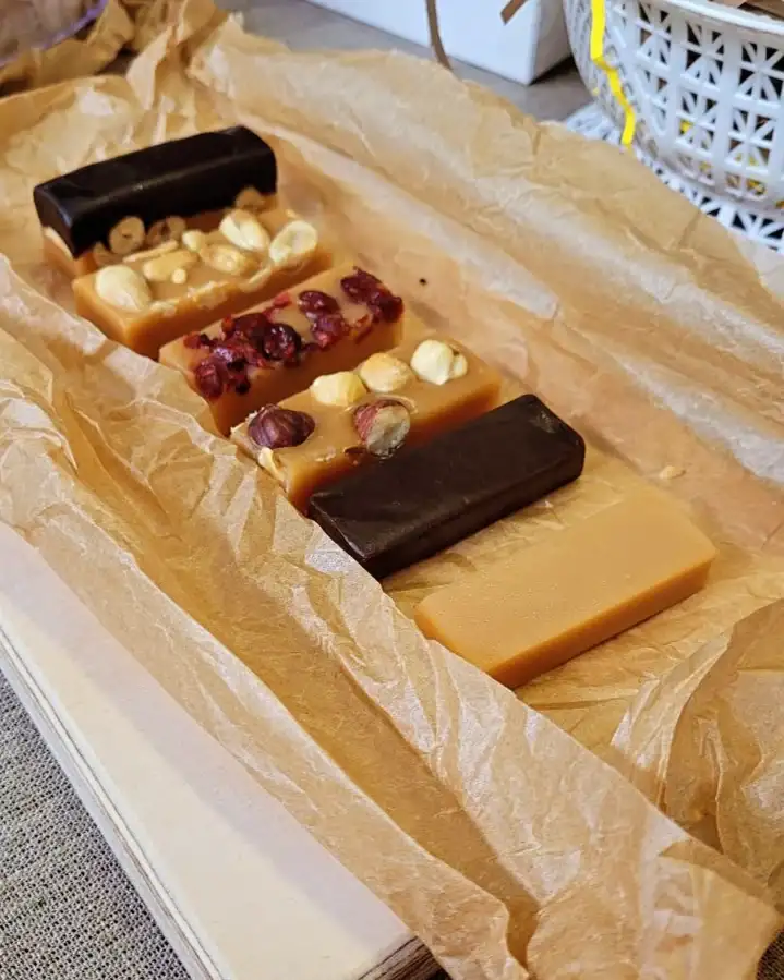 Ассортимент: — Солёный арахис — С миндалём — С фундуком — С орехом пекан — С вяленой клюквой — С вяленой вишней — С клубникой