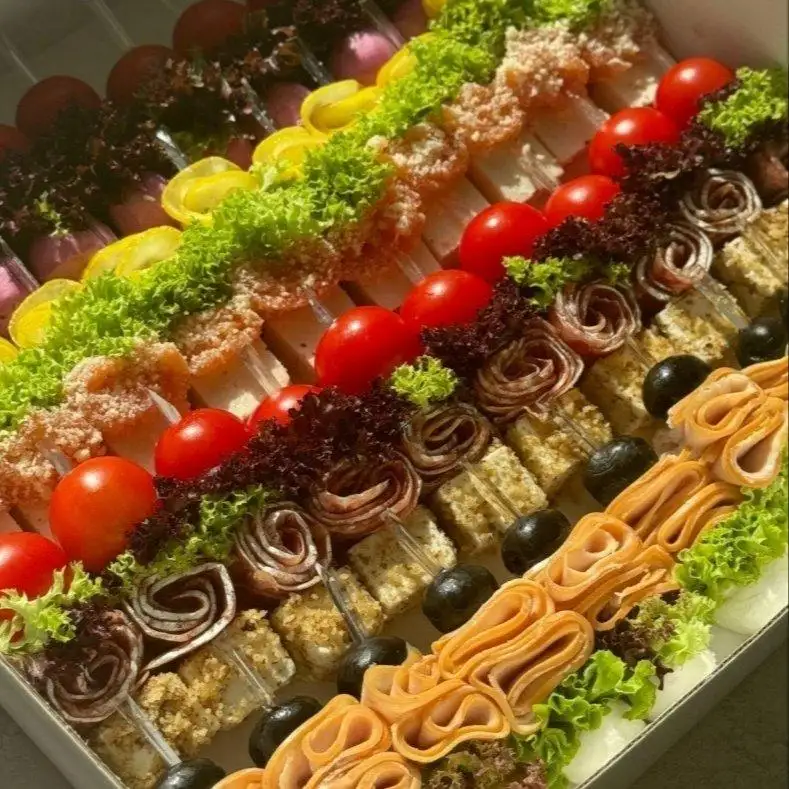 Канапе классика — моцарелла, черри, салат 10 шт; Канапе из форели, лимона, салата, творожного сыра 10 шт; Канапе из колбасы, черри, салата, творожного сыра в грецких орехах 10 шт; Канапе с ветчиной, маслинами, салатом, сыром моцарелла 10 шт. Вес бокса 1200 грамм.