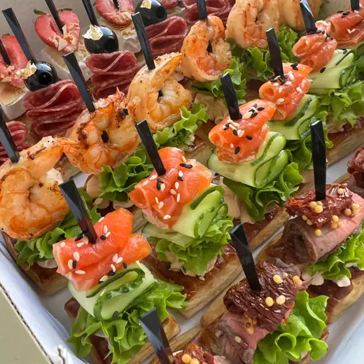 — канапе с бри и клубникой с миндальными лепестками — канапе с маслиной и салями — канапе с креветкой — канапе с сёмгой, огурцом и салатом — канапе с ростбифом, вяленым томатом и французской горчицей