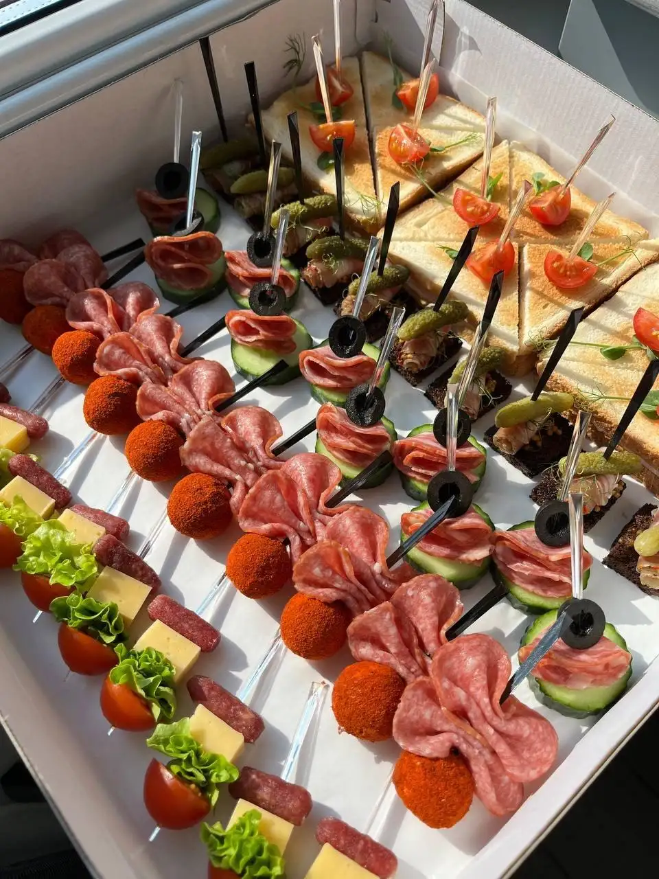 Канапе с пиколини — 10 шт Канапе с салями и копченым сыром — 10 шт Канапе с сальчисоном — 10 шт Канапе бекон на гренке — 10 шт Канапе сендвич с ветчиной — 12 шт