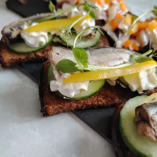 Хлеб бородинский, слив.сыр, овощи, зелень. Майонез, чеснок.