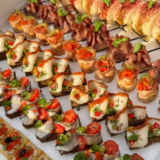 Сэндвичи с тунцом 10 шт Пикантные мешочки 10 шт Рулетики с беконом 12 шт Крекеры с пломбиром из бородинского и копченой форелью 24 шт Брусочки с салом 10 шт Брусочки с килькой 10 шт