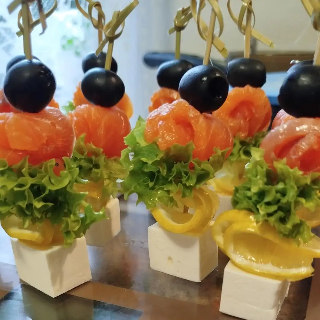 Творожный сыр, лимон, форель, маслины и лист салата