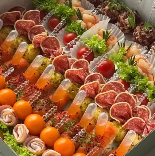 ✔️Канапе «ЧИЗБОЛ С САЛЯМИ» — 8 шт. ✔️Канапе С САЛЯМИ — 10 шт. ✔️Канапе С КРЕВЕТКОЙ — 8 шт. ✔️Канапе «НИГИРИ С ФОРЕЛЬЮ» — 10 шт. ✔️Канапе С КОПЧЕНОЙ ВЕТЧИНОЙ И СЫРОМ — 10 шт.