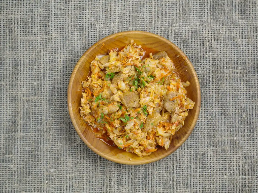 Описание: сытное и ароматное блюдо, в котором свежая капуста тушится вместе с свининой. Блюдо подают как самостоятельное или с гарниром, например, с картофелем или хлебом. Состав: капуста, свинина (т/б, постная), морковь, лук, масло сливочное, томаты протёртые, зелень укропа, специи. Вес: 550 г Способ приготовления: блюдо полностью готово к употреблению. Разогреть удобным для вас способом.