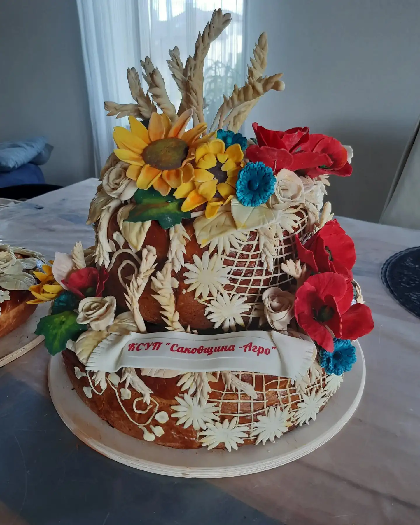 Каравай круглый двухэтажный или трёхэтажный с цветными цветами из теста и сахарной пасты.