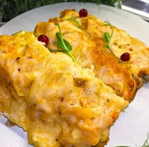 Хек Лук, морковь пассированная Томат Сырная шапочка