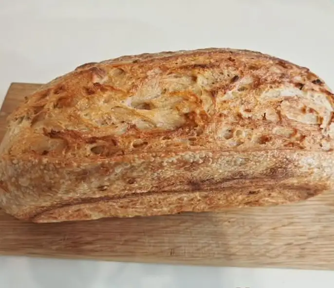 Вес: 900–970 г Как правильно хранить , чтобы хлеб не плесневел: • Завернуть в льняную или хлопковую ткань • Хранить в деревянной хлебнице • Хранить нарезанным срезом вниз на доске • Замораживать сразу после остывания (если знаешь, что не съешь за 2–3 дня) Как долго хранится хлеб на закваске: • Комната (18—22°C): 3–6 дней. • Холодильник: не рекомендую — хлеб черствеет быстрее, так как испаряется влага из хлеба. • Морозилка: до 2 месяцев, особенно удобно замораживать порционно.