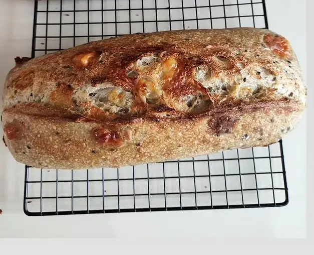 Состав: закваска (пшеничная мука, вода), пшеничная мука в/с, пшеничная мука ц/з, ржаная мука ц/з, семена льна, семена подсолнечника, пармезан, сушёный томат, соль, вода. Вес: 900–970 г