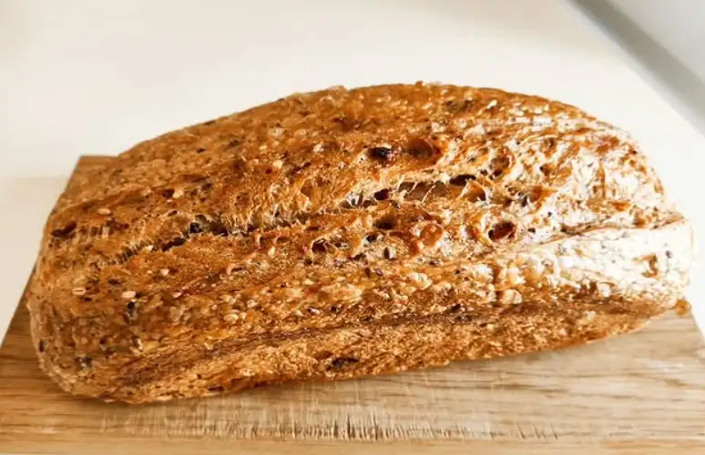 Вес: 900–970 г Как правильно хранить , чтобы хлеб не плесневел: • Завернуть в льняную или хлопковую ткань • Хранить в деревянной хлебнице • Хранить нарезанным срезом вниз на доске • Замораживать сразу после остывания (если знаешь, что не съешь за 2–3 дня) Как долго хранится хлеб на закваске: • Комната (18—22°C): 3–6 дней. • Холодильник: не рекомендую — хлеб черствеет быстрее, так как испаряется влага из хлеба. • Морозилка: до 2 месяцев, особенно удобно замораживать порционно.