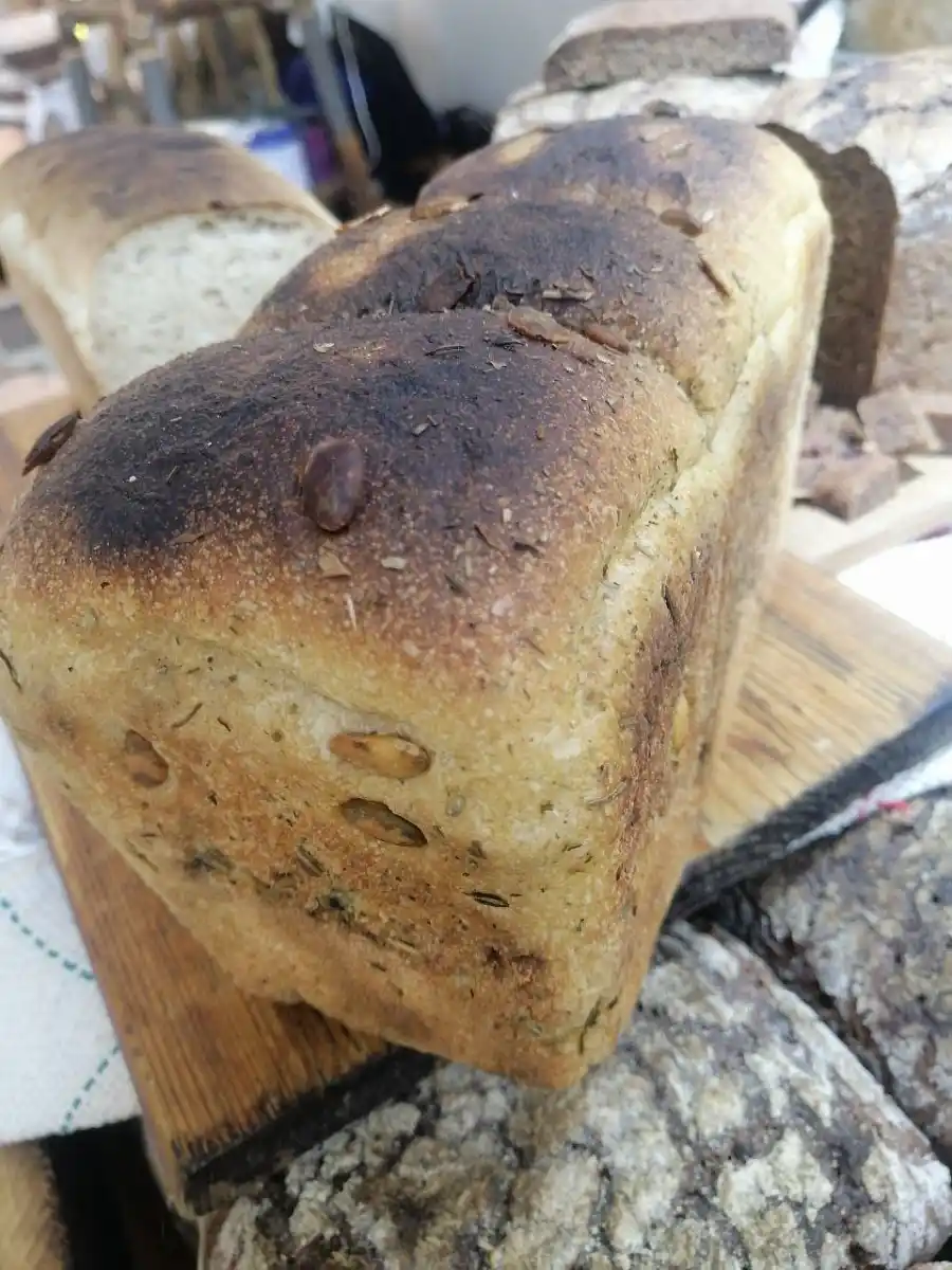 Состав: Закваска пшеничная Мука пшеничная цельнозерновая Мука пшеничная 1 сорт Мука пшеничная высший сорт Вода Молоко или пиво крафтовое (будет указано в ассортименте, что печём) Масло сливочное домашнее (либо не меньше 82.5% жирности) Мякоть тыквы, запечённая в печи с куркумой и перцем Соль Тыквенные семечки для посыпки