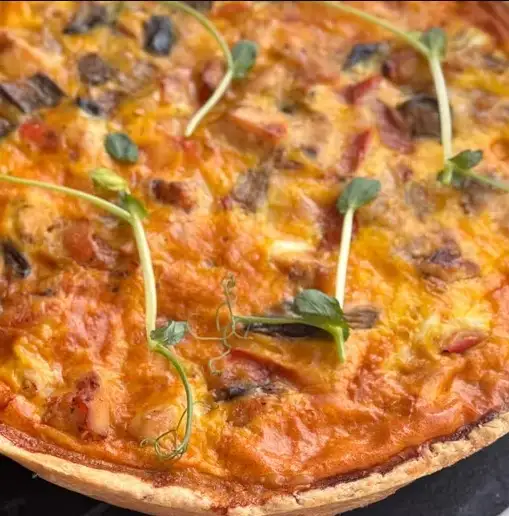 Песочное тесто, курица, баклажан, сладкий перец, лук репчатый, специи соль, яйцо, сыр, сливки