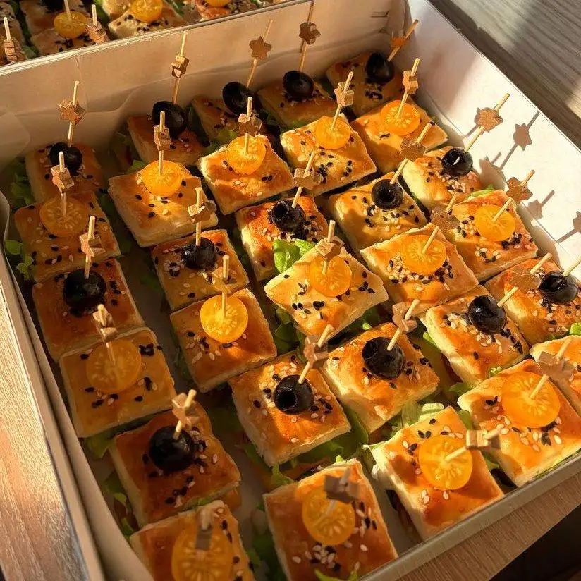 Бокс-ассорти слоёных закусок, 30 шт, 3 вкуса. Отлично подходит для welcome-фуршетов, пикников, дополнение к основному столу. Рассчитан на 6−12 человек. *декор и сервировка может отличаться