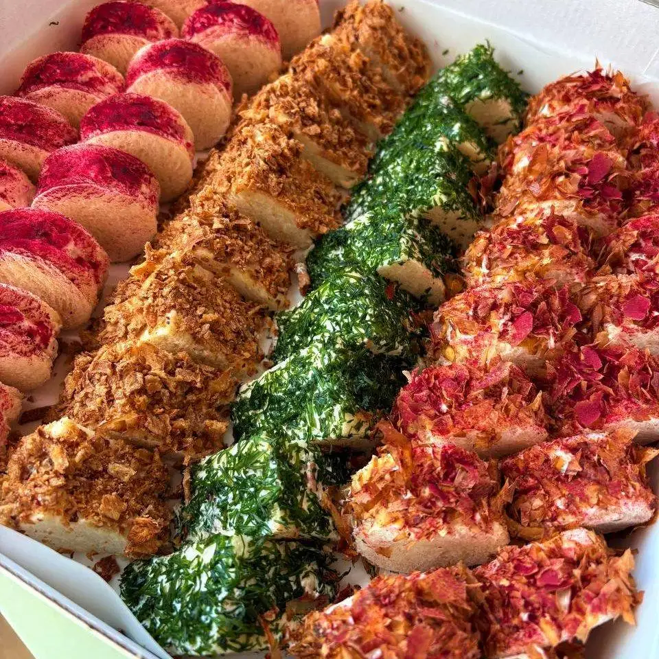 Вкусы: — мини-сендвич с тунцом, 16 шт — мини-сендвич с лососем, 16 шт — мини-сендвич с беконом, 16 шт