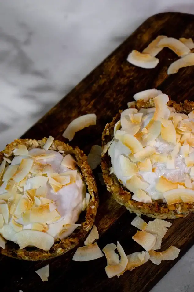 Хрустящая основа из злаков, банана и сухофруктов, с добавлением кокосовых чипсов и нежной начинки из кокосовых сливок.